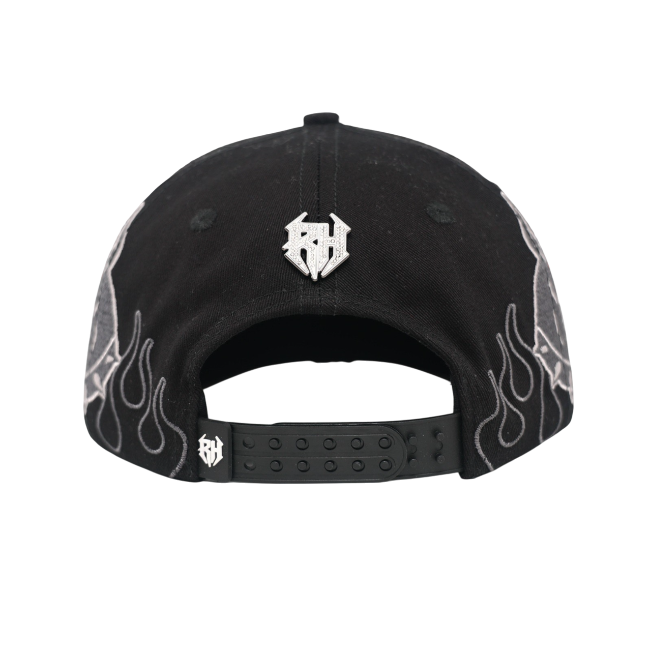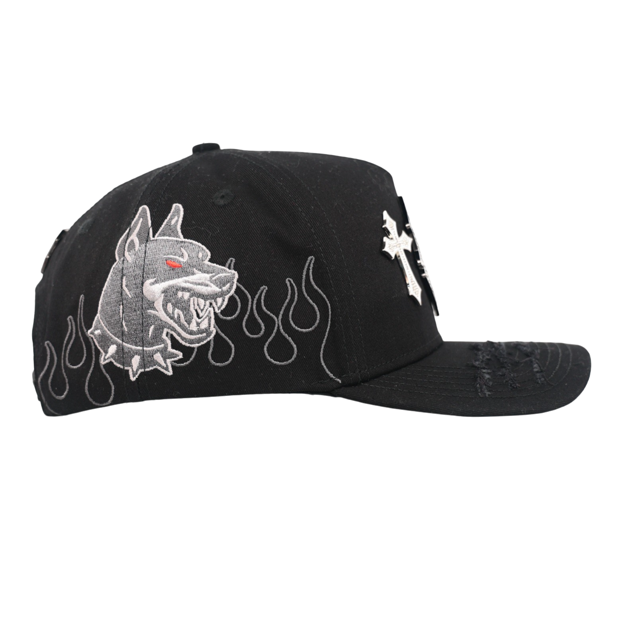 Along the side, a snarling guardian dog marks territory — your silent enforcer — surrounded by flame embroidery symbolizing power, danger, and unbreakable loyalty.