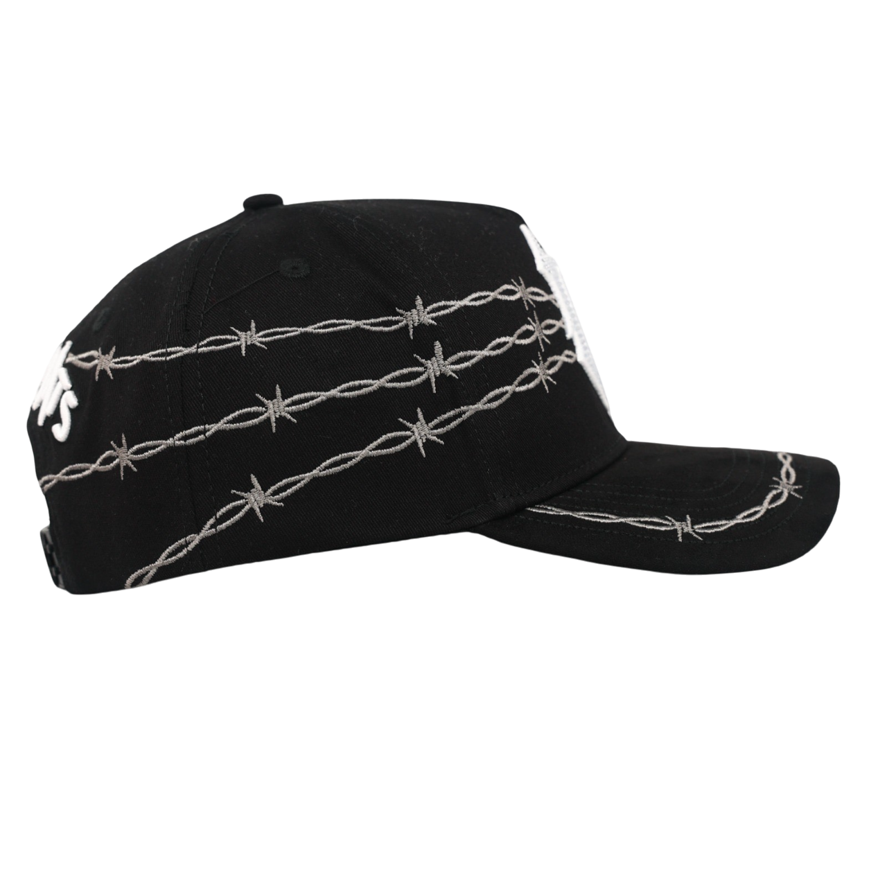 • 🔗 Wrap-around barbed-wire stitching on crown & brim